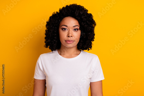 Photo of serious confident woman with perming coiffure dressed white t-shirt look at you isolated on vibrant yellow color background