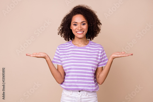 Photo of shiny adorable girl dressed purple t-shirt showing arms scales empty space isolated beige color background