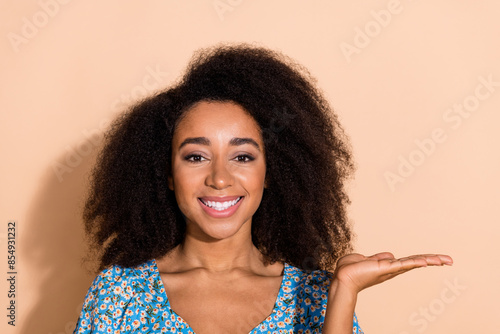 Photo of shiny attractive lady dressed blue blouse showing arm empty space isolated beige color background