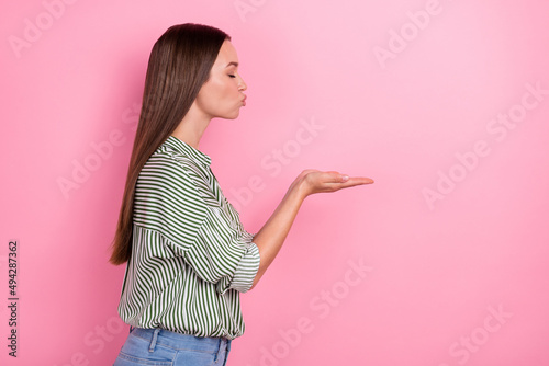 Photo of shiny charming woman wear striped shirt sending arms kiss empty space isolated pink color background