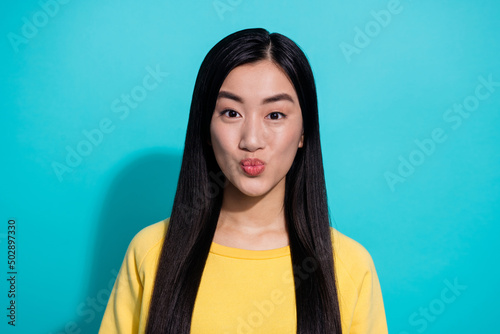 Photo of shiny sweet lady dressed yellow sweater sending you kiss isolated turquoise color background
