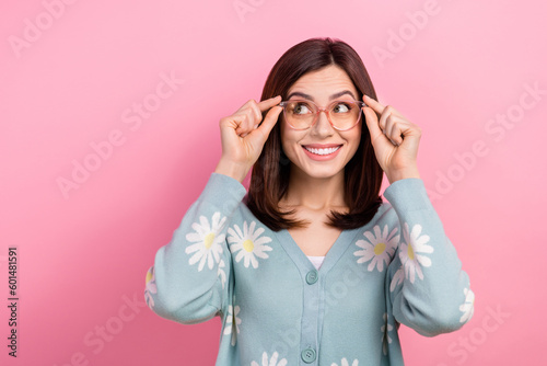 Photo of shiny tricky lady wear turquoise clothes arms spectacles looking empty space isolated pink color background