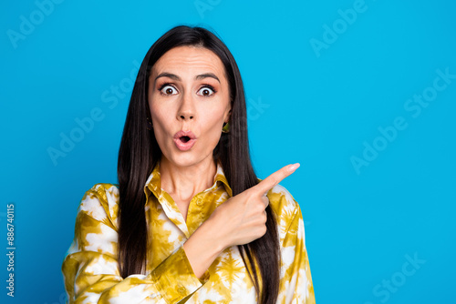 Photo of shocked elegant lovely woman wear stylish clothes presenting empty space poster isolated on blue color background