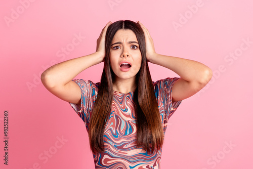 Photo of shocked impressed lady dressed print clothes hands arms head open mouth isolated pink color background