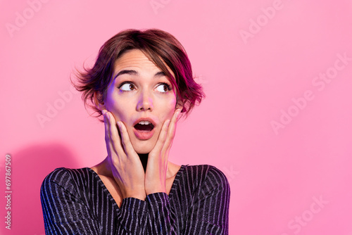 Photo of shocked impressed lady wear glamour outfit arms cheeks looking empty space isolated pink color background