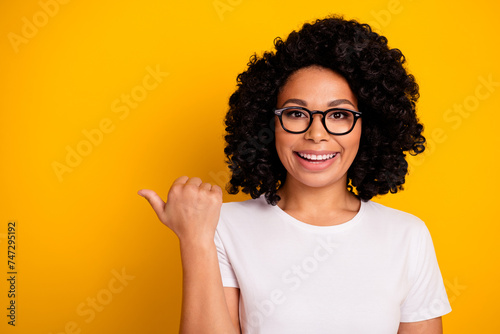 Photo of smart clever lady dressed white t-shirt eyewear pointing thumb empty space isolated yellow color background