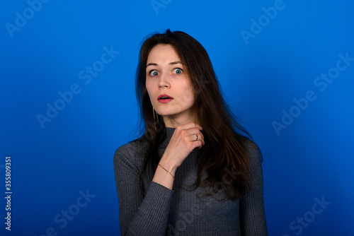 Photo of smiling, cheerful young female in grey dress on blue background