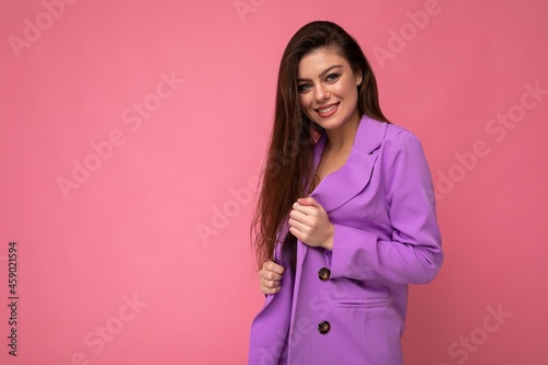 Photo of smiling young business woman wearing purple suit isolated on background. Copy space