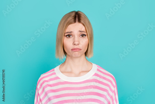 Photo of stressed depressed girl dressed striped sweater listening bad news isolated teal color background