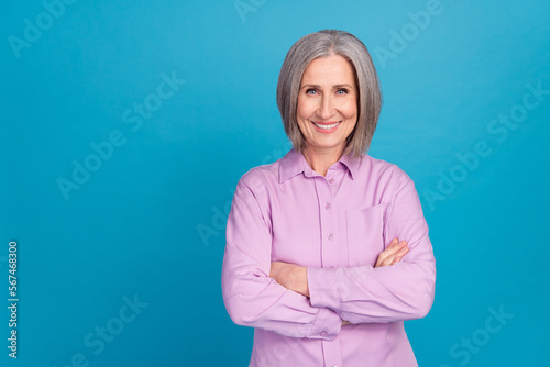 Photo of successful adorable lady arm folded wear violet stylish clothes demonstrate empty space banner isolated on blue color background