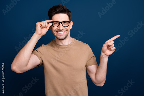 Photo of successful nice man wear stylish clothes demonstrate empty space buy novelty optics shop isolated on dark blue color background