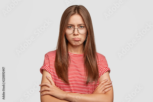 Photo of sullen attractive woman purses lips, keeps hands crossed, looks from under forehead, purses lower lip, expresses negative emotions after having quarrel with husband, isolated on white wall