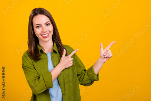 Photo of sweet adorable young woman dressed green shirt smiling pointing finger empty space isolated yellow color background