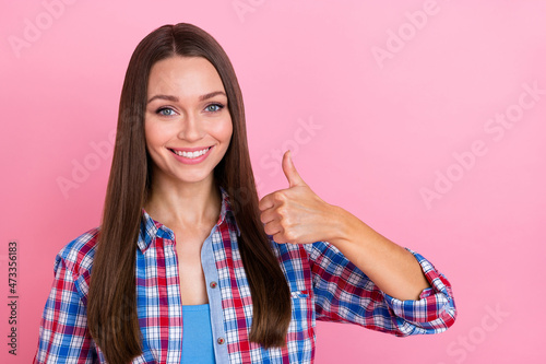 Photo of sweet brunette millennial lady thumb up wear blue shirt isolated on pastel pink color background