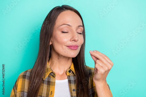 Photo of sweet young brunette lady try food wear plaid shirt isolated on teal color background