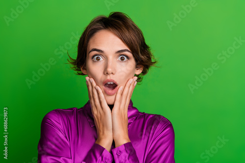 Photo of terrified impressed lady open mouth hands touch face cheeks unexpected information empty space isolated on green color background