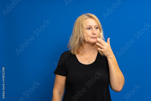 Photo of thoughtful contemplative woman pursing lips with mysterious expression, looking puzzled to side, dressed in t-shirt, isolated over blue background with free copy space.