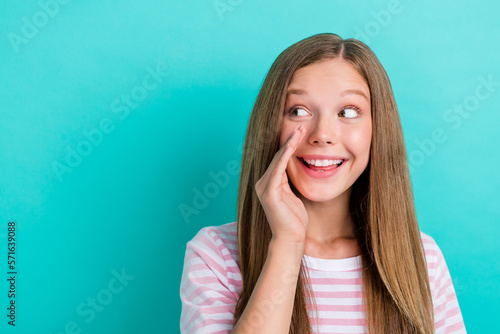 Photo of tricky cunning lady wear striped t-shirt arm mouth telling secret looking empty space isolated turquoise color background