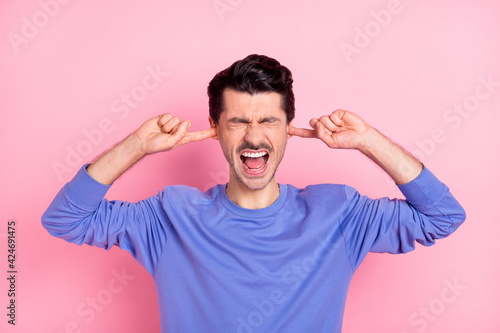 Photo of unhappy annoyed irritated young man close fingers ears loud noise isolated on pink color background