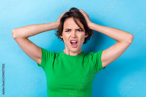 Photo of unsatisfied young woman hands head problems forgot correct answers failed last driving test examination isolated on cyan color background