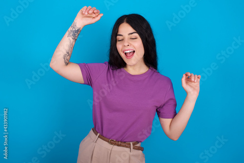 Photo of upbeat young beautiful tattooed girl wearing purple t-shirt standing against blue has fun and dances carefree wear being in perfect mood makes movements. Spends free time on disco party