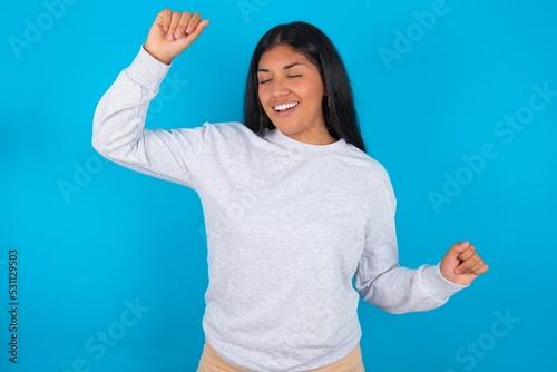 Photo of upbeat Young latin woman wearing gray sweater blue background has fun and dances carefree wear being in perfect mood makes movements. Spends free time on disco party