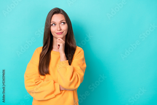 Photo of young adorable pretty attractive nice cute woman touch chin dreamy look empty space information news isolated on cyan color background
