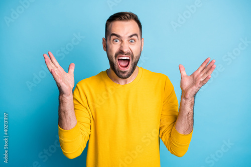 Photo of young angry furious stressed depressed man screaming conflict quarrel isolated on blue color background
