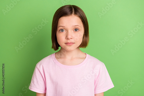 Photo of young attractive lovely school girl happy positive smile focused isolated over green color background