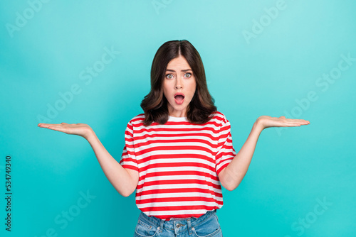 Photo of young attractive nice gorgeus girlish lady curly hairstyle open mouth hold palms dont know choice advertisement isolated on cyan color background