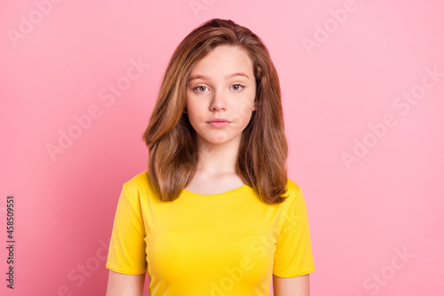 Photo of young attractive school girl serious confident wear yellow t-shirt isolated over pink color background