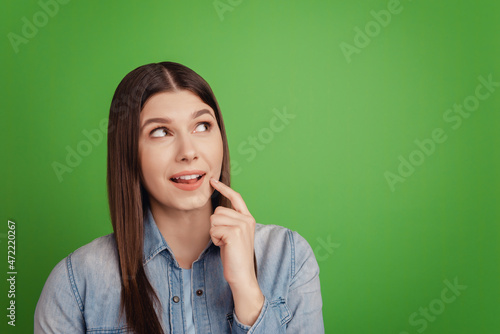 Photo of young attractive woman finger touch chin thoughtful look empty space isolated over green color background