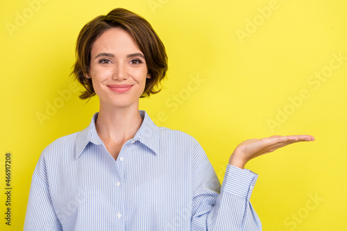 Photo of young attractive woman happy positive smile hold hand product offer advertise isolated over yellow color background