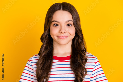 Photo of young charming beautiful positive smiling cheerful girl with long curly hair isolated on yellow color background