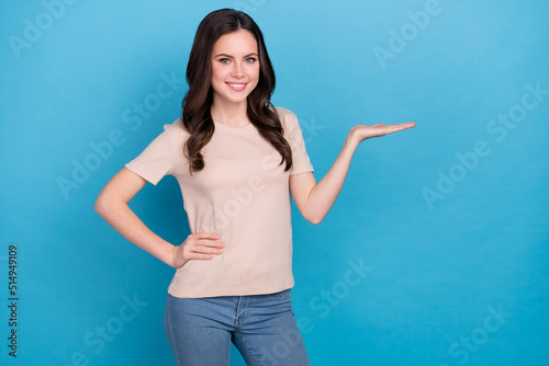Photo of young charming woman hold hand advertising product isolated on blue color background