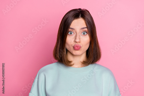 Photo of young charming woman plump lips cosmetology procedure romantic isolated over pink color background