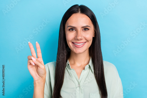 Photo of young cheerful girl good mood show fingers peace v-symbol isolated over blue color background