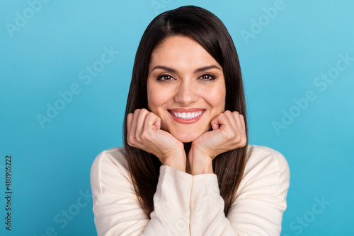 Photo of young cheerful girl hands touch chin dream toothy smile isolated over blue color background