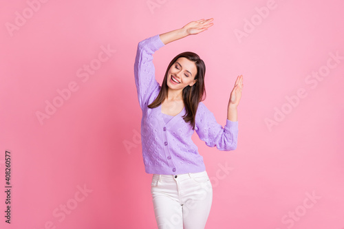 Photo of young cheerful girl happy positive smile have fun enjoy dance disco isolated over pink color background