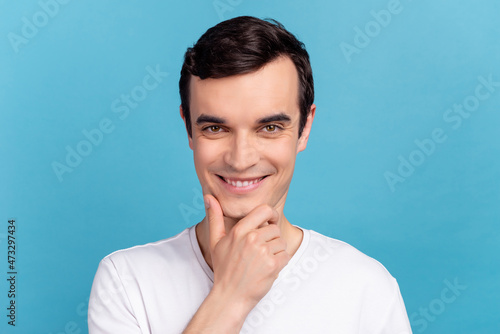 Photo of young cheerful man enjoy skin care visit barber shop thoughtful isolated over blue color background