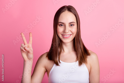 Photo of young cheerful woman good mood show fingers peace cool v-symbol isolated over pink color background