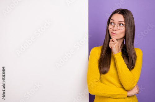 Photo of young curious girl minded hmm look empty space advert thoughtful isolated over purple color background