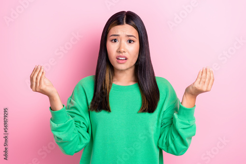 Photo of young dissatisfied worker japanese lady argue conflict misunderstanding employer wear trendy sweatshirt isolated on pink color background