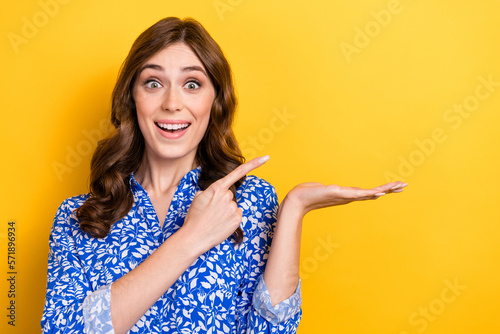 Photo of young excited charming positive surprised girl work office project manager hold palm recommend her job isolated on yellow color background