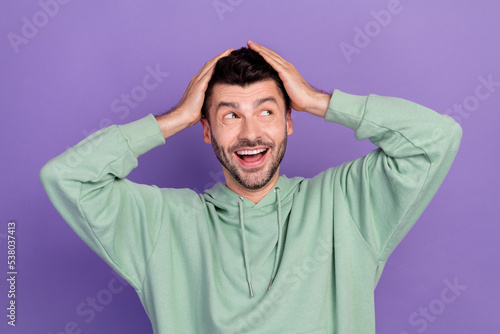 Photo of young excited cute positive student man stubble touch his head surprised good news look empty space isolated on purple color background