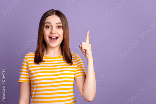 Photo of young excited girl point finger plan genius choose candid clever isolated over violet color background