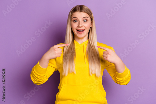 Photo of young excited woman indicate fingers herself proud winner isolated over violet color background