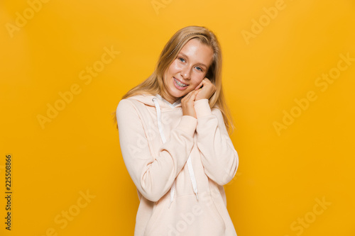 Photo of young female student or school girl with dental braces smiling at camera, isolated over yellow background