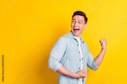 Photo of young funky funny excited screaming male look copyspace celebrate victory isolated on yellow color background