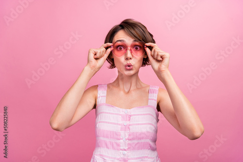 Photo of young girl amazed shocked put eyeglasses pouted lips reaction eyesight isolated over pink color background